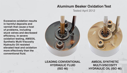 Increased heat can cause varnish to form on metal surfaces, including valves, pumps and bearings. Its soft, sticky composition ultimately hardens into a harmful veneer that can reduce fluid flow, plug filters, stick valves and increase friction. Synthetic Multi-Viscosity Hydraulic Oil is fortified with anti-varnish additives that chemically react with the building blocks of varnish, inhibiting its formation. It helps hydraulic systems remain clean and long-lasting.